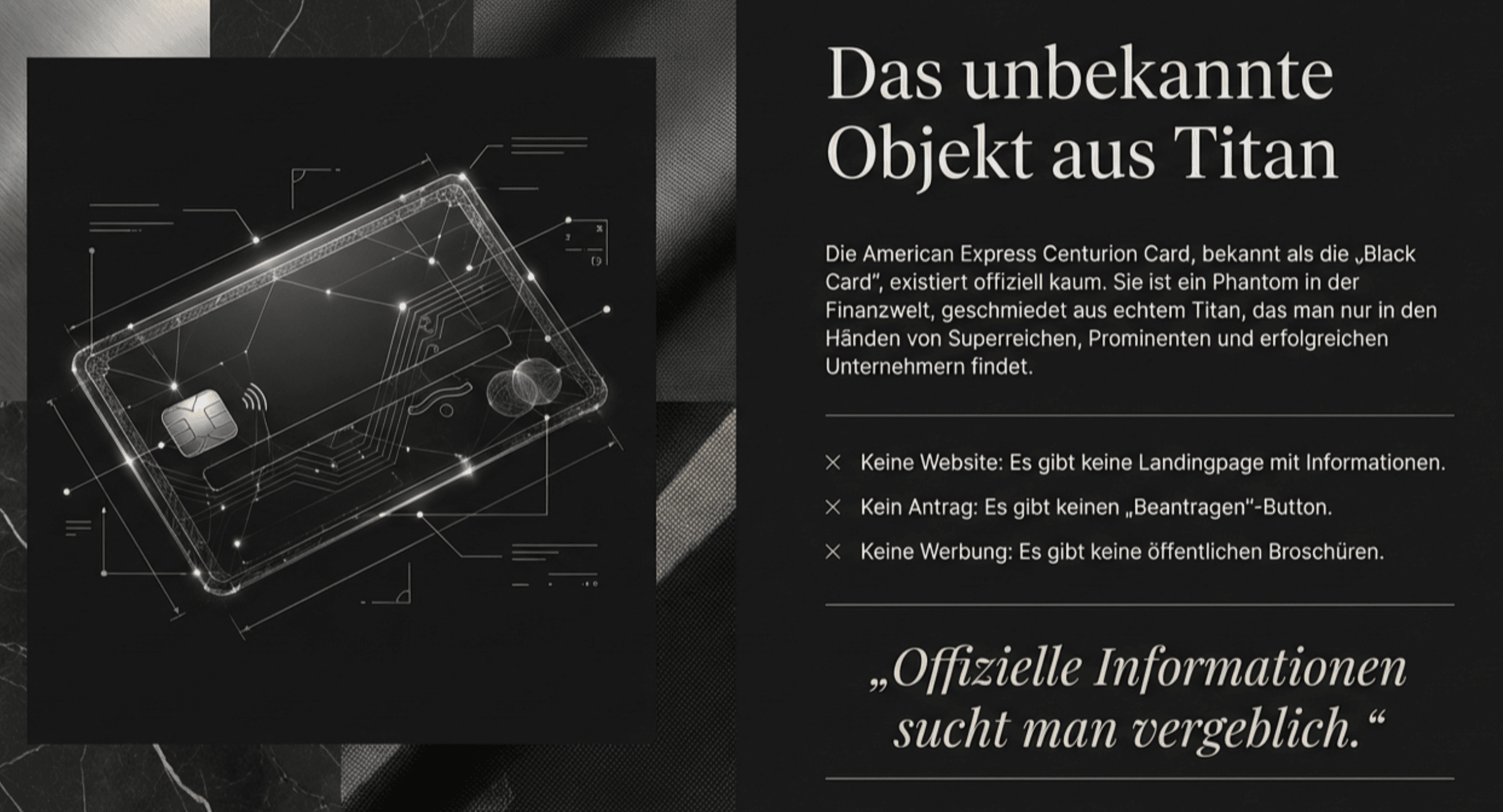 Sie ist ein Mythos aus Titan: Die American Express Centurion Card, im Volksmund besser bekannt als die „Black Card“. Offizielle Informationen dazu sucht man auf der Website von American Express vergeblich. Es gibt keinen „Beantragen“-Button und keine Broschüren. Man findet sie nur in den Händen von Superreichen, Prominenten und erfolgreichen Unternehmern.