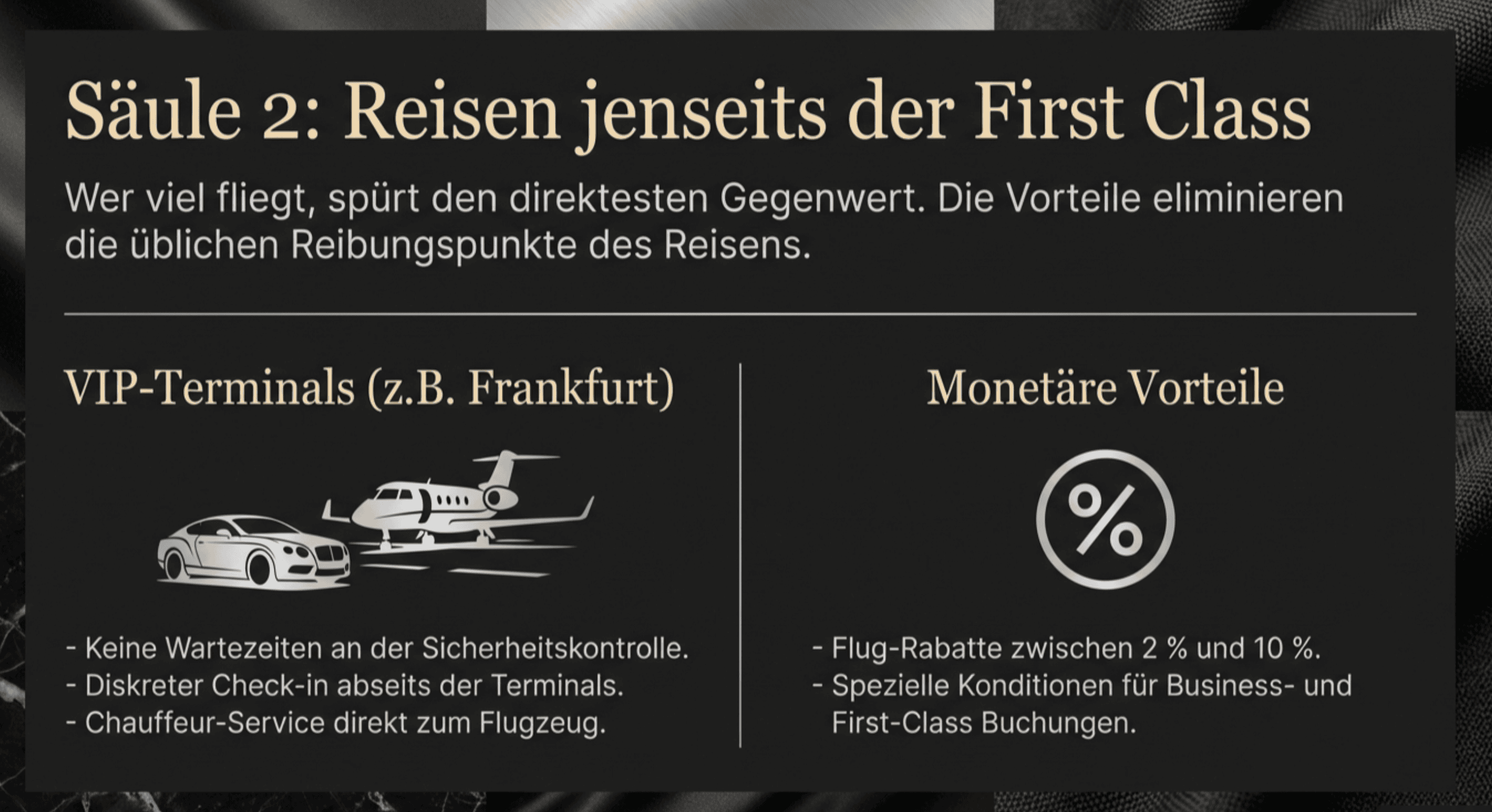 - VIP-Terminals: An Flughäfen wie Frankfurt können Inhaber separate VIP-Terminals nutzen. Das bedeutet: Keine Wartezeiten, diskrete Sicherheitskontrollen und Chauffeur-Service direkt zum Flugzeug.