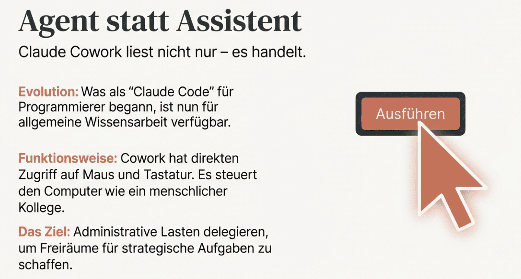 Claude Cowork markiert einen entscheidenden Wendepunkt: Wir bewegen uns weg von reinen Chatbots, die uns nur erzählen, wie wir etwas tun sollen, hin zu echten Agenten, die die Arbeit tatsächlich für uns erledigen.