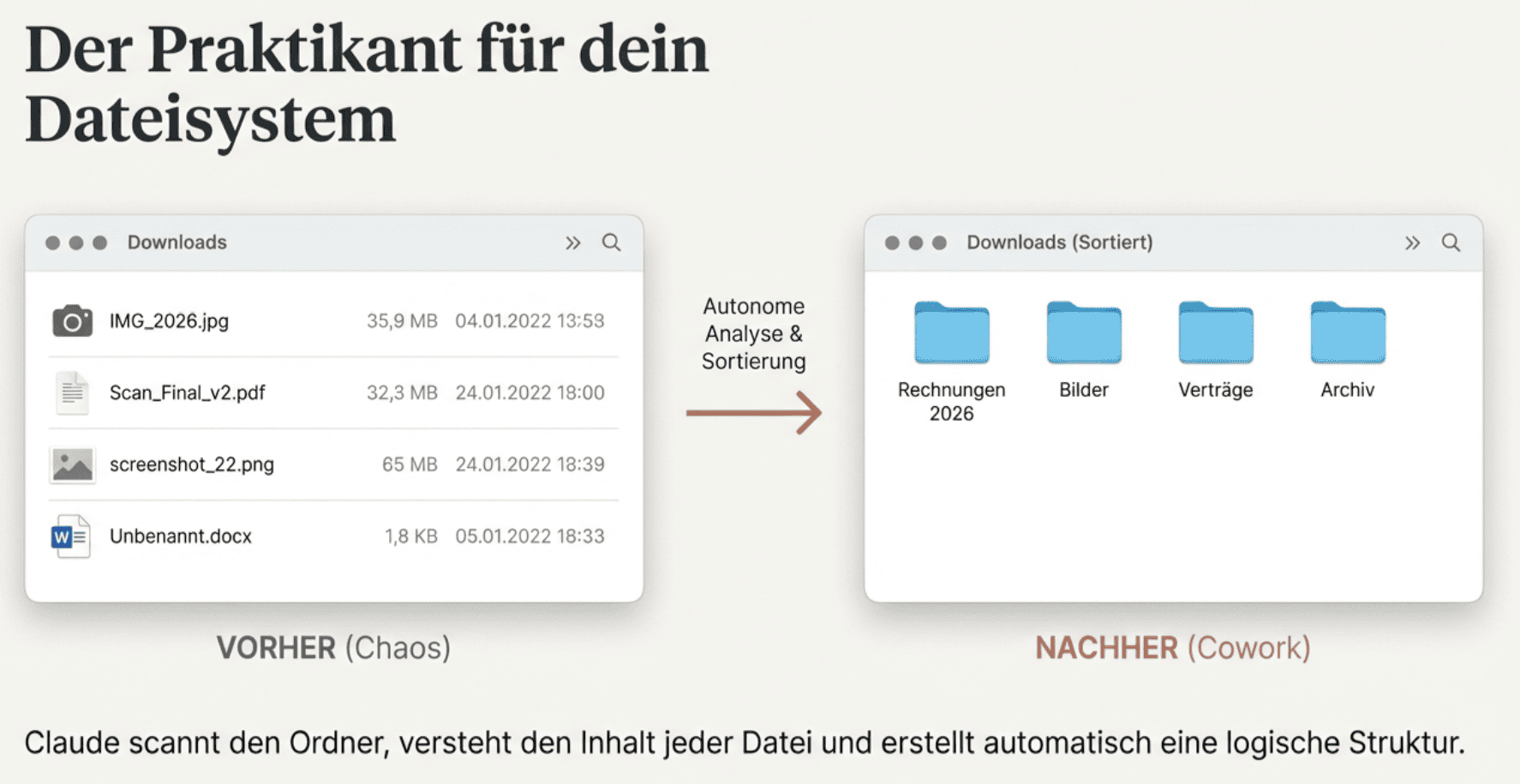 Anders als ein Chatbot in einem Browser-Tab hat Cowork direkten Zugriff auf (ausgewählte) Bereiche deines Computers. Es liest nicht nur Texte, es handelt.