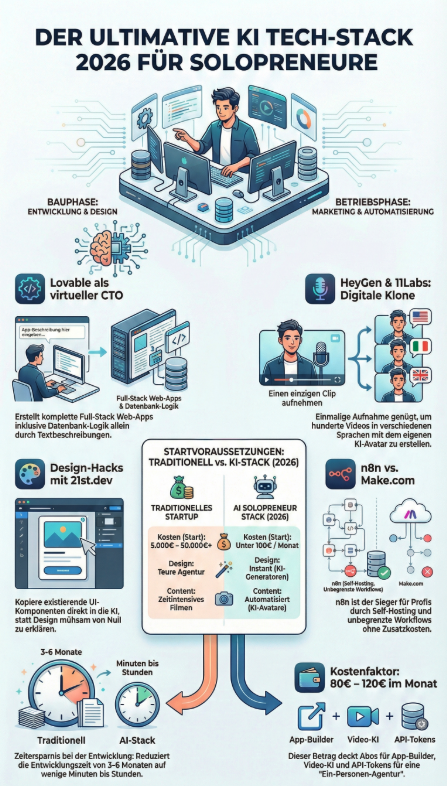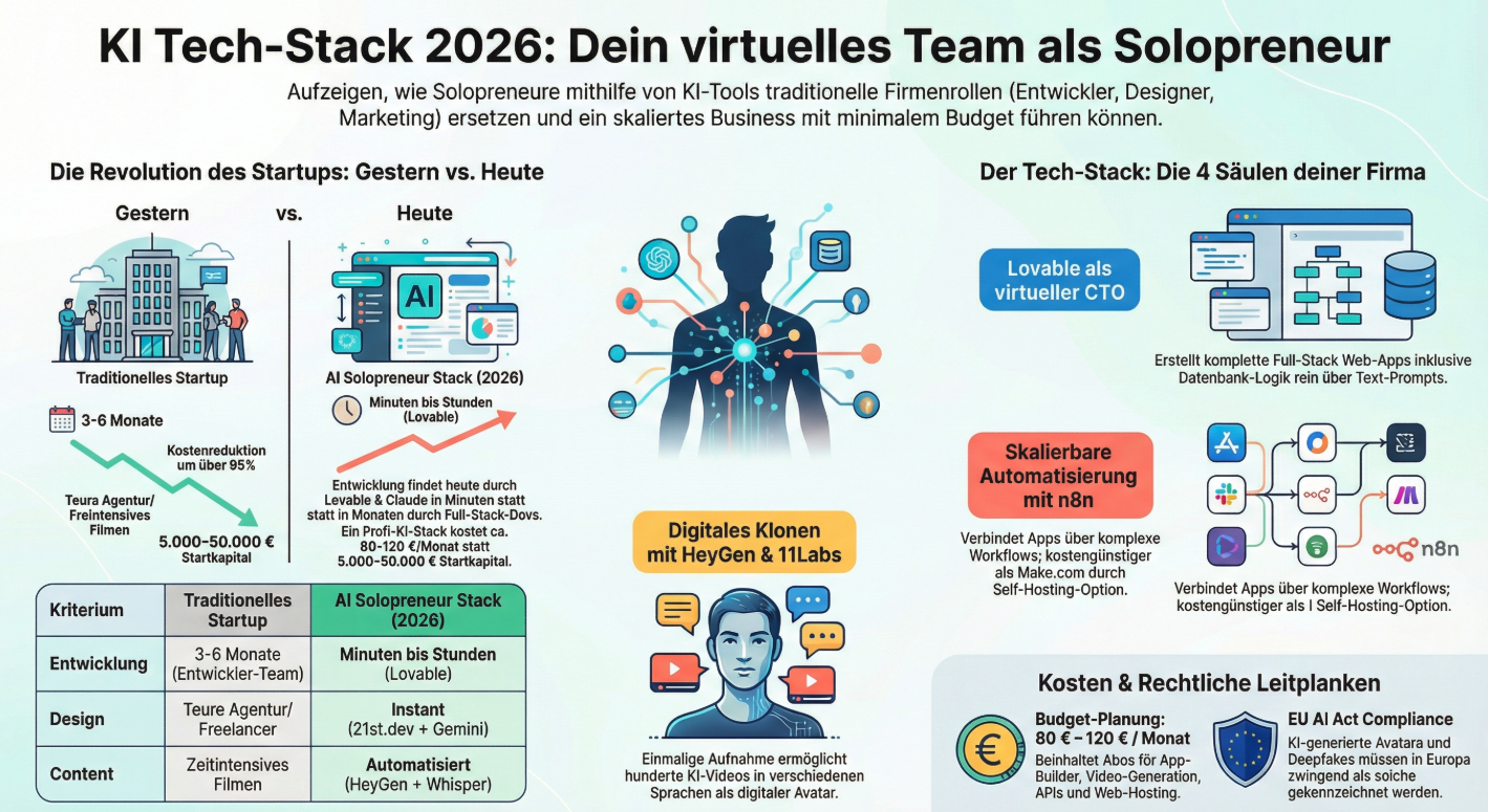 | Kriterium | Traditionelles Startup | AI Solopreneur Stack (2026) |
