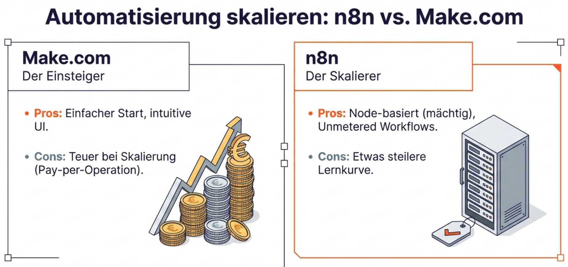 - n8n: Hat eine etwas steilere Lernkurve („Node-basiert“), aber du kannst es auf einem eigenen 5€-Server hosten und unendlich viele Workflows laufen lassen, ohne mehr zu zahlen. Für skalierbare Business-Modelle ist n8n der klare Sieger.