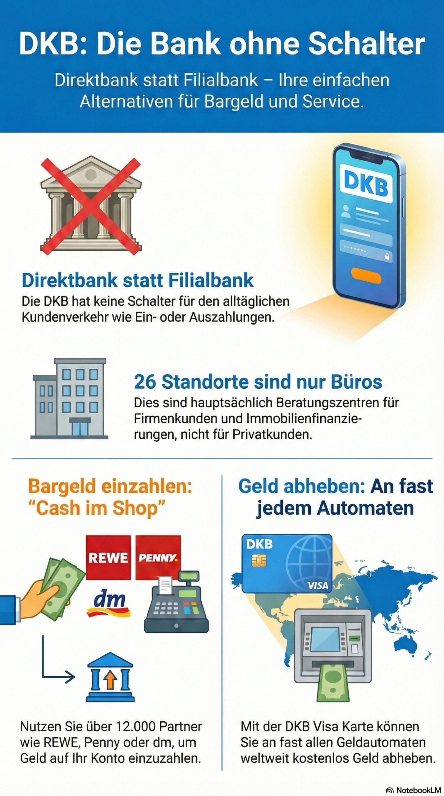 - DKB = Direktbank: Die Bank hat keine klassischen Filialen für den Schalterverkehr (Geld abheben/einzahlen am Schalter ist nicht möglich).