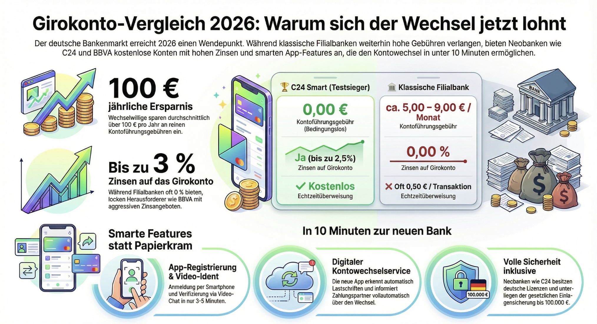 Zahlst du immer noch monatliche Gebühren nur dafür, dass eine Bank dein Geld „verwaltet“? In Zeiten von Inflation und steigenden Kosten ist das ein Luxus, den sich niemand leisten sollte. Das Jahr 2026 markiert einen Wendepunkt im deutschen Bankenmarkt: Neue Player wie die C24 Bank* und die spanische Großbank BBVA* greifen die etablierten Platzhirsche wie DKB und ING mit aggressiven Angeboten an.