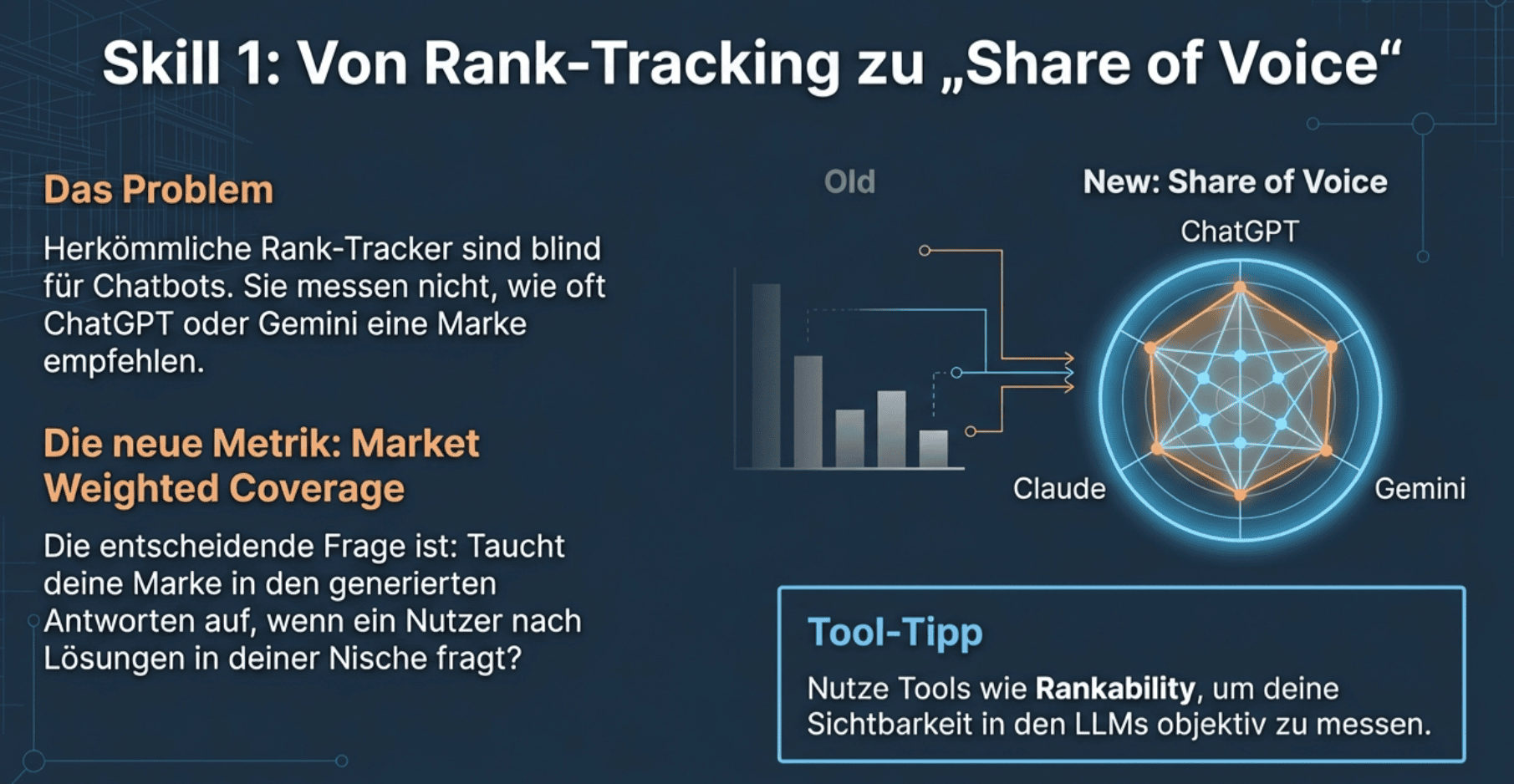Das Ziel ist „Market Weighted Coverage“: Taucht deine Marke in den Antworten auf? Tools wie Rankability helfen dir, genau diese Sichtbarkeit in den LLMs zu prüfen.