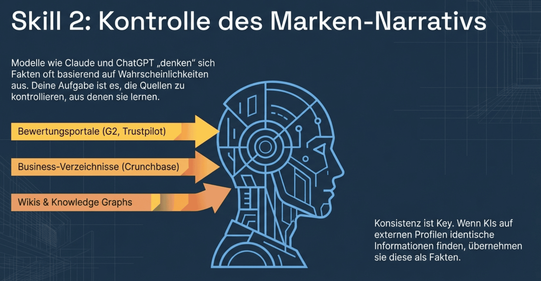 - Knowledge Base statt Keywords: Füttere die LLMs (Large Language Models) mit strukturierten Daten über deine Marke.