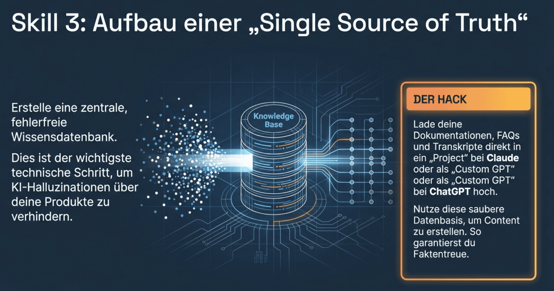 Der Hack: Lade deine Dokumentationen, FAQs und Transkripte in ein „Project“ bei Claude oder als „Custom GPT“ bei ChatGPT hoch. Nutze diese saubere Datenbasis, um Content zu erstellen. So vermeidest du KI-Halluzinationen in deinen eigenen Inhalten.
