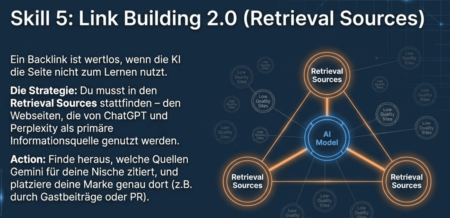 Ein Backlink bringt wenig, wenn die KI die Seite nicht crawlt. Du musst in den „Retrieval Sources“ stattfinden – also auf den Webseiten, die von ChatGPT und Perplexity als primäre Informationsquelle genutzt werden. Finde heraus, welche Quellen Gemini für deine Nische zitiert, und platziere dich dort.