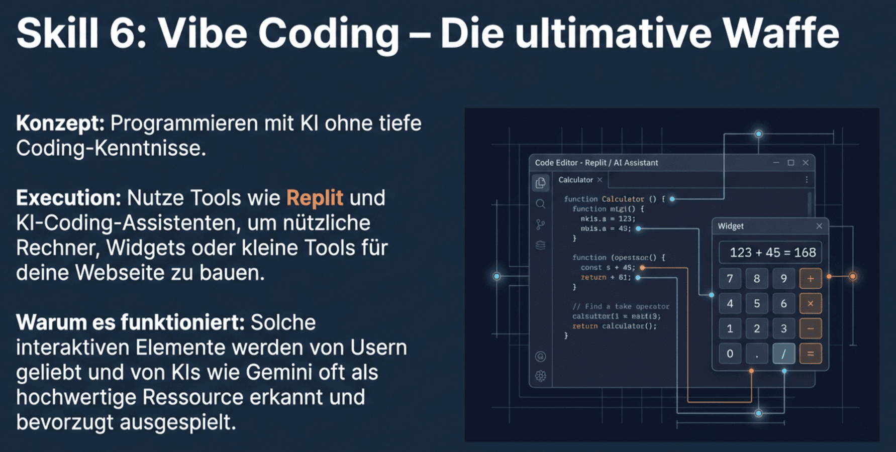 Die ultimative Waffe im KI SEO: Baue eigene kleine Tools. Nathan nutzt Replit und KI-Coding-Assistenten, um nützliche Rechner oder Widgets zu erstellen. Solche interaktiven Elemente werden von Usern geliebt und von KIs wie Gemini oft als hochwertige Ressource erkannt.