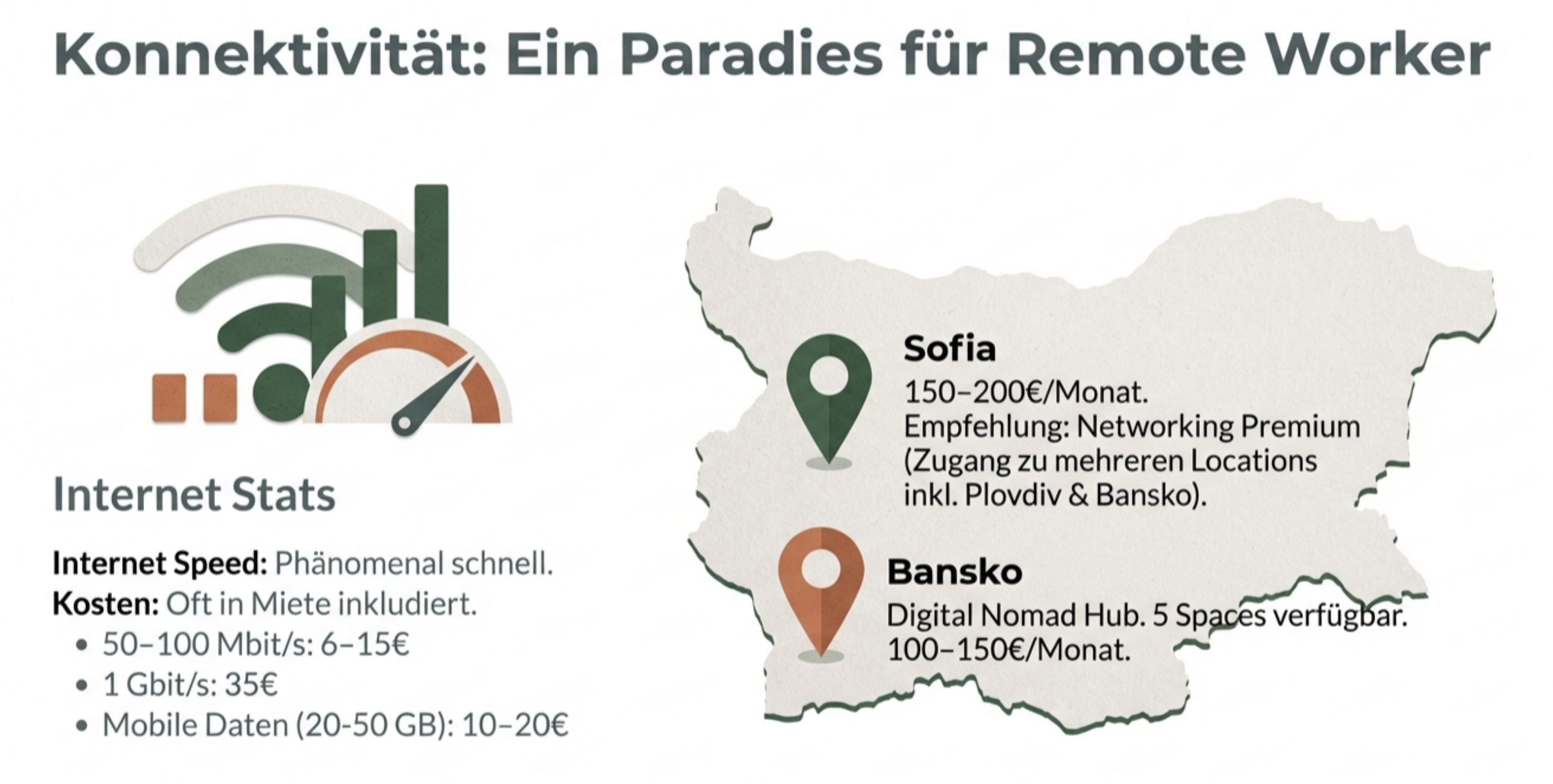 Die kleine Stadt Bansko ist mittlerweile sehr beliebt bei digitalen Nomaden geworden. Daher gibt es nach meinem Wissen dort aktuell 5 Co-Working-Spaces, die ebenfalls sehr empfehlenswert sind. Die Kosten liegen bei 100 bis 150 Euro pro Monat.