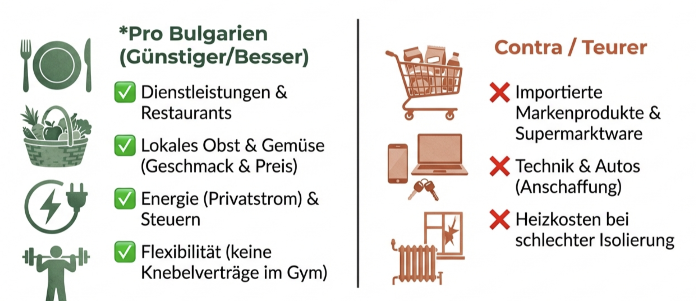 Meiner Erfahrung nach sind die Lebenskosten in den letzten Jahren stark angestiegen. Laut dem statistischen Bundesamt lag die Inflationsrate im letzten Jahr bei 8,6 Prozent. Einige Dinge sind trotzdem immer noch deutlich günstiger, als in Deutschland oder der Schweiz. Auf der anderen Seite gibt es auch Produkte, die in Bulgarien deutlich mehr kosten.