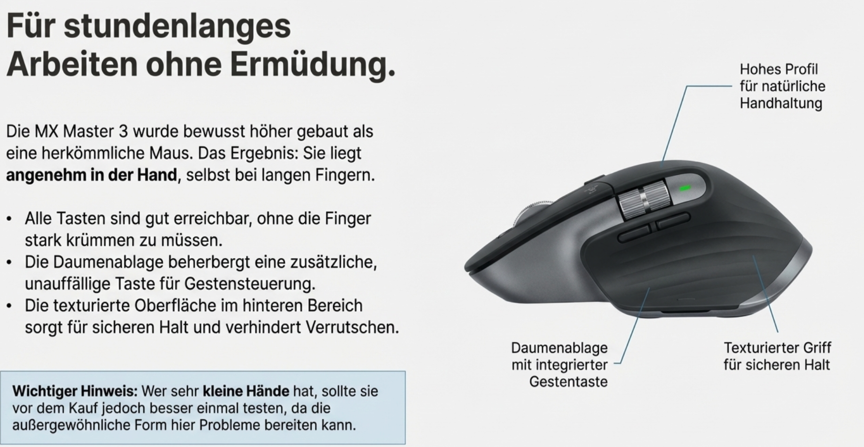 Wenn man sehr kurze Finger hat, ist die Maus möglicherweise etwas zu groß. In diesem Fall ist es sinnvoll, die MX-Master 3 vor dem Kauf in der Praxis zu testen.