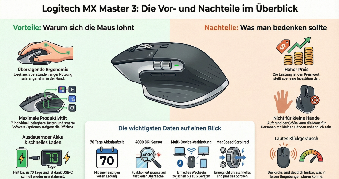 Mein Fazit:Besitzt du bereits die MX Master 3? Ein Upgrade lohnt sich meiner Meinung nach nur, wenn dich das Klickgeräusch massiv stört oder du auf einen extrem hochauflösenden Monitor umgestiegen bist.