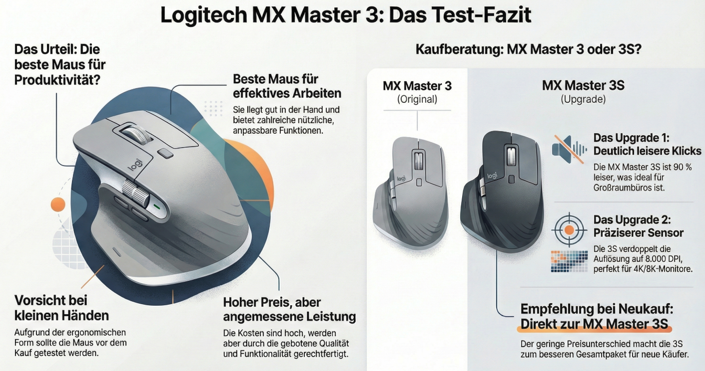 Kaufst du neu, würde ich direkt zur MX Master 3S greifen. Der Preisunterschied ist oft gering, und die Kombination aus leisem Arbeiten und präziserem Sensor macht sie zum aktuell besten Gesamtpaket für Professionals.