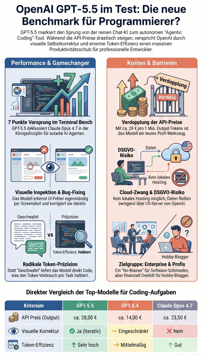 Meine Empfehlung zu den Benchmarks: Wer hochkomplexe Agenten oder Enterprise-Software baut, nimmt GPT-5.5. Wer nur ein Python-Skript für seinen Saugroboter schreiben will, bleibt bei den günstigeren Vorgängern.