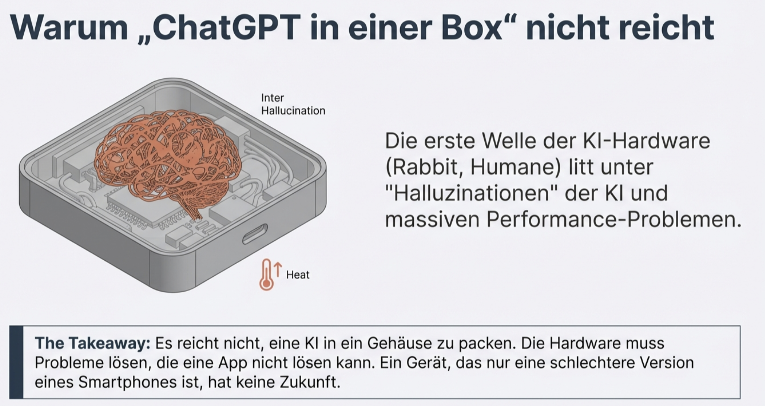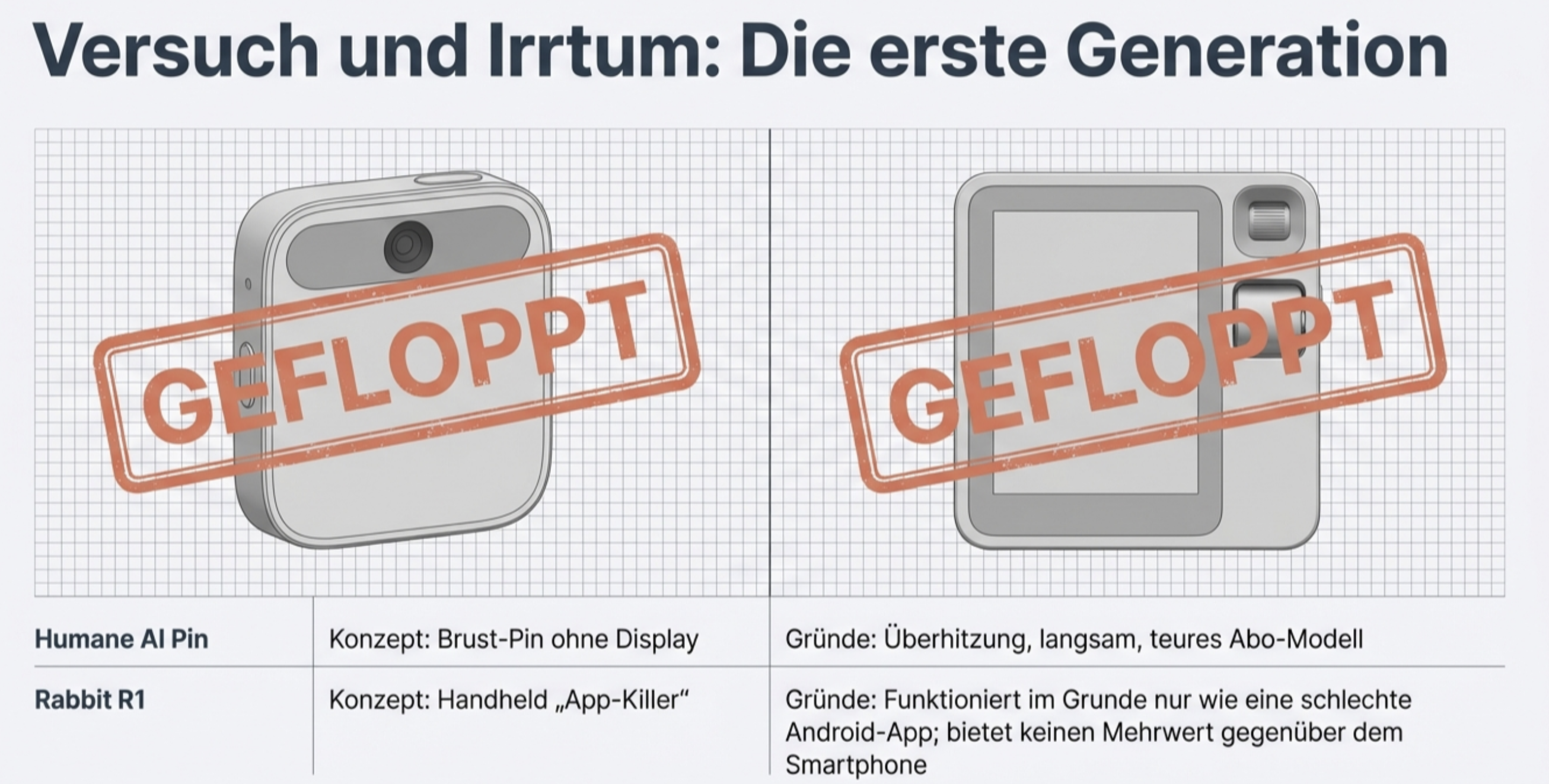 - Die Flops: Rabbit R1 und Humane AI Pin scheiterten an schlechter Performance und Hitzeentwicklung.