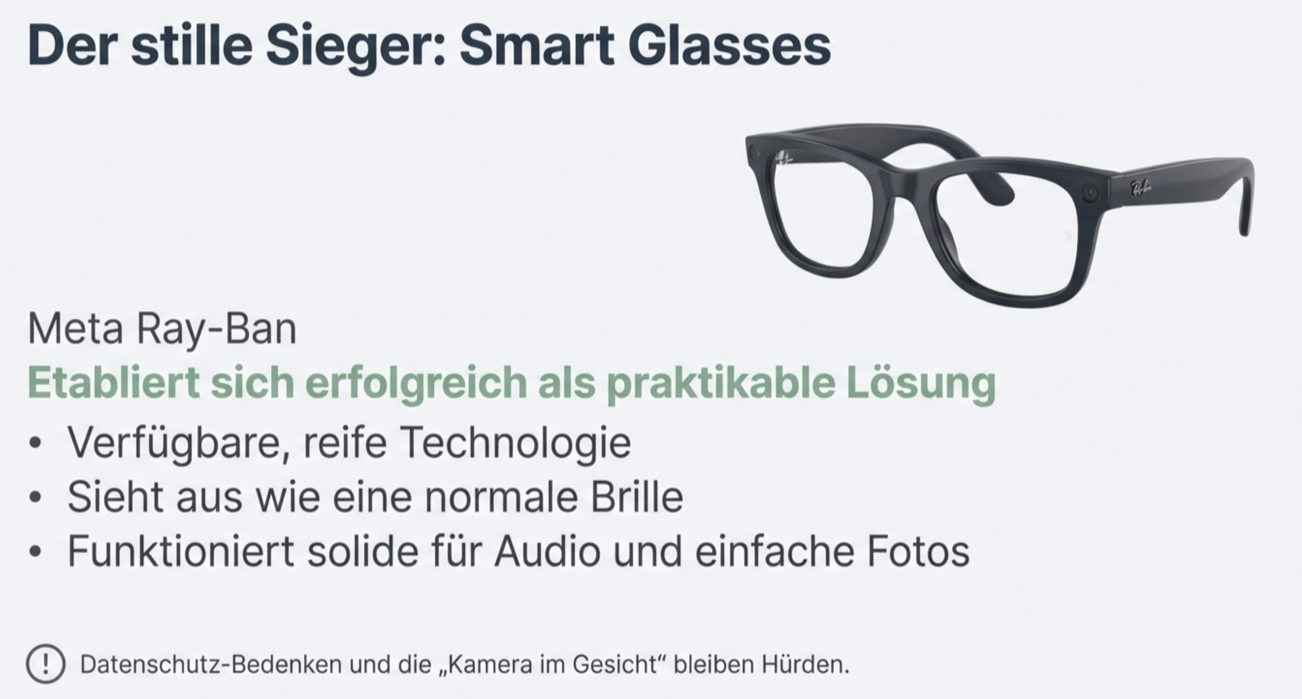 - Smart Glasses führen: Metas Ray-Ban Brillen etablieren sich erfolgreich als praktikable Lösung.