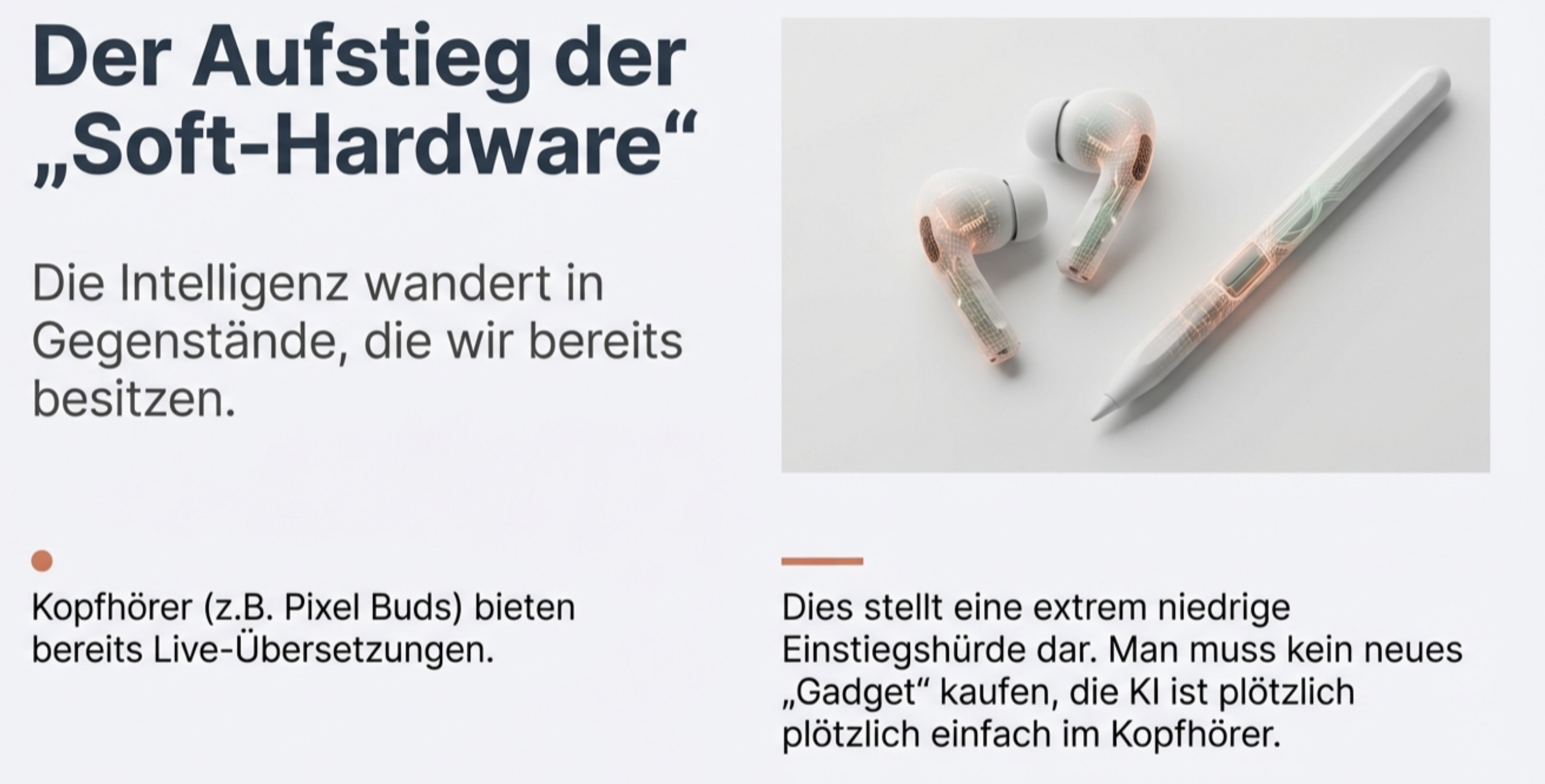 - Soft-Hardware: Viele Funktionen wandern in Kopfhörer (z.B. Live-Übersetzung in Pixel Buds), was eine niedrige Einstiegshürde darstellt.